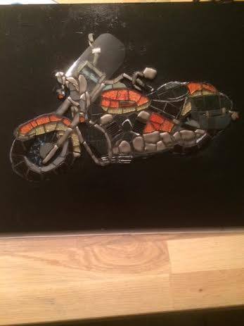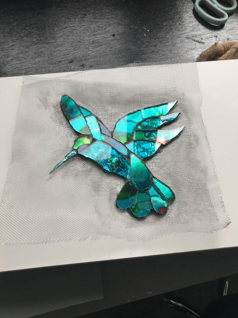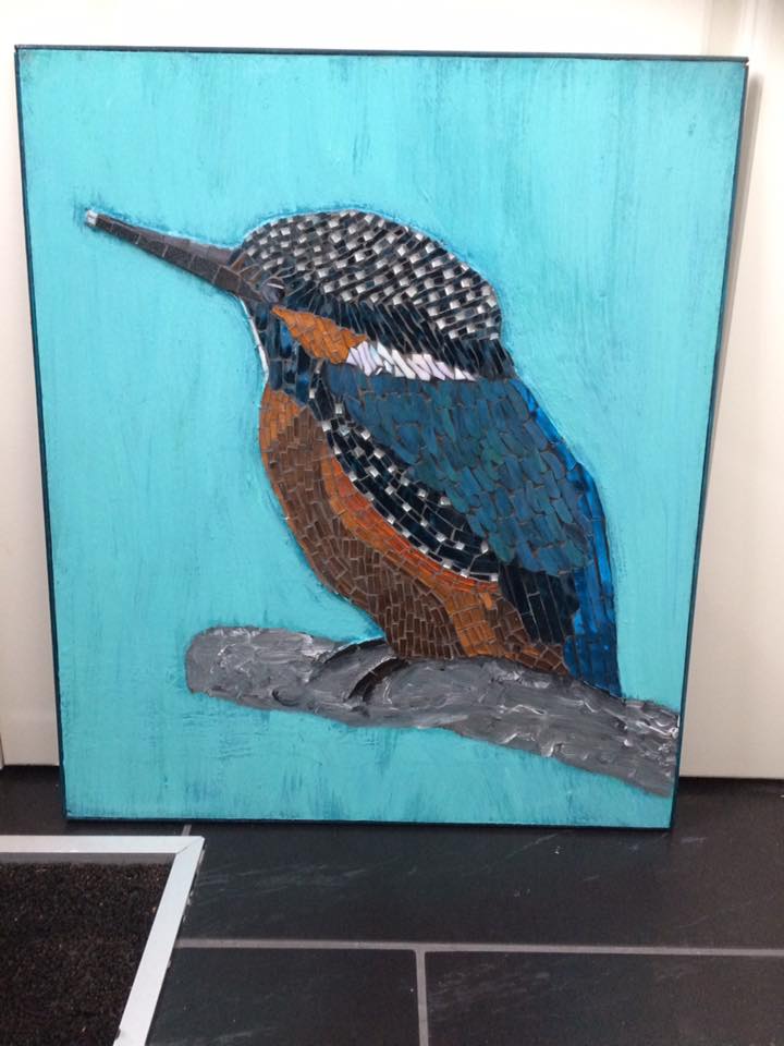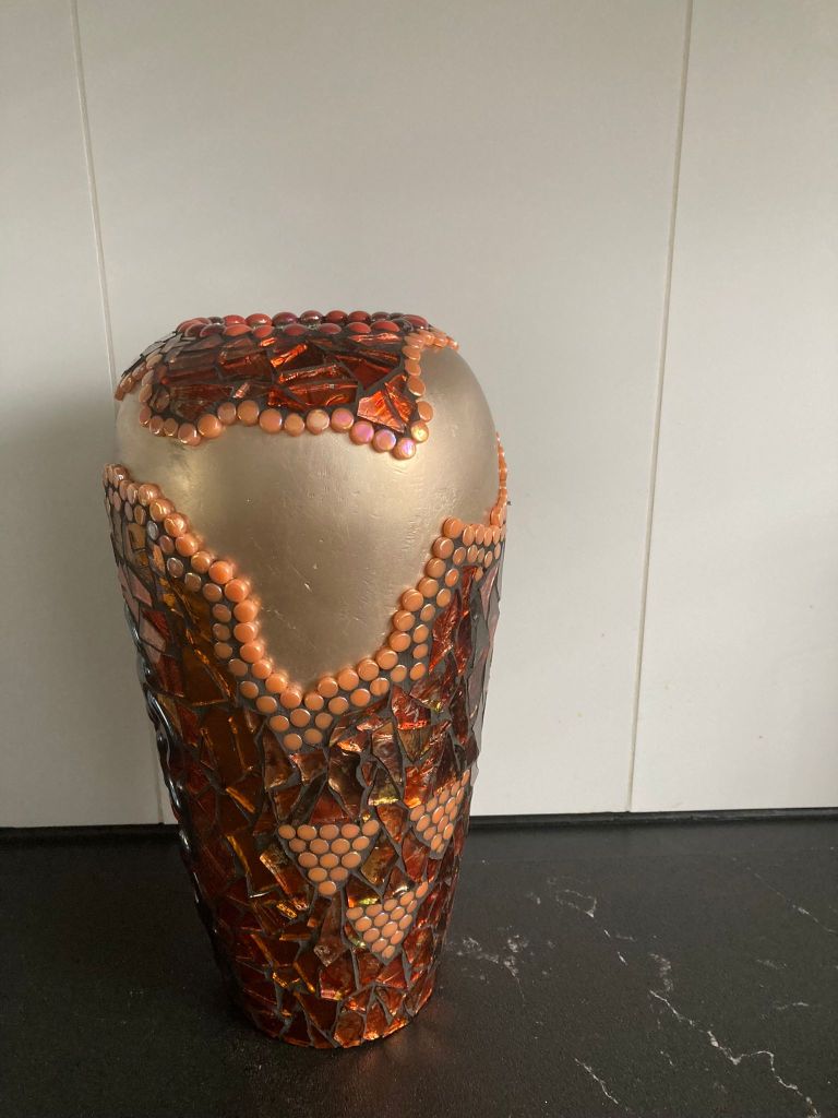 Particuliere opdracht voor een schaal en een vaas. Glasmozaïek verwerkt op een schaal van 45 cm doorsnede en hoge vaas.