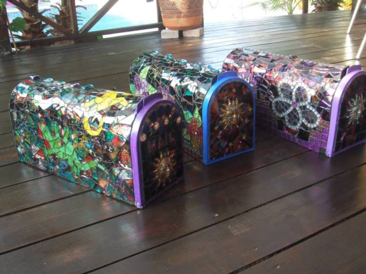 De zon, het strand, de kleuren en de bevolking zelf waren een welkome inspiratiebron. Ik begon met het bewerken van Amerikaanse brievenbussen, het maken van wandmozaïeken en schatkistjes.